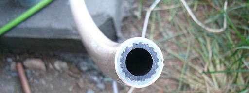このホースなら凍結してもゴムの伸縮で破裂して水漏すると言う事がありません、だから断熱も被服もしない業者もいますが勘違いだと思います、長年経過すると日に当たった表面が真っ黒に劣化して更にカビが生え、まだら模様になることもあります。もちろん断熱がしてないと寒い冬,風呂までお湯を送る時冷めてしまいますだから当店は断熱も被服も施します。